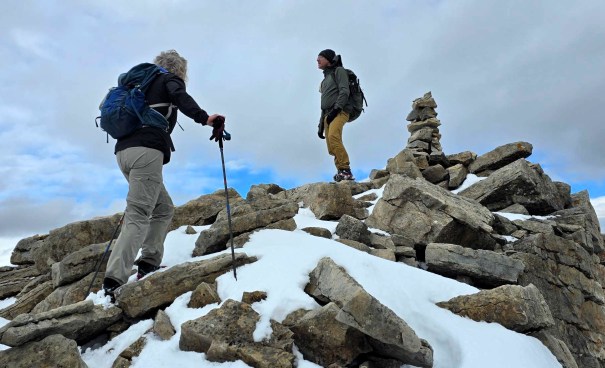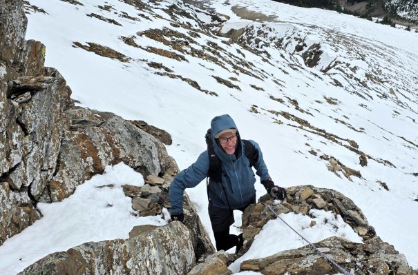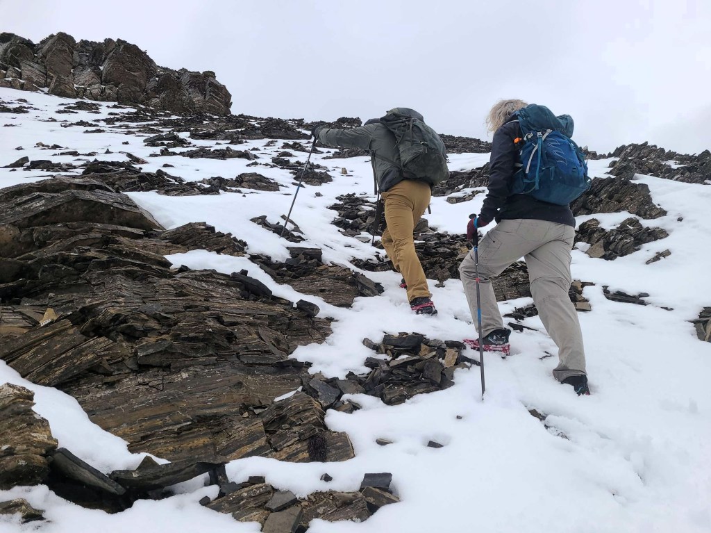 We were now firmly in the snow. If there’s a trail in the scree, we didn’t find it hidden under the snow. Instead, we generally aimed for the ridge ridge, and trudged our way up the jumbled, rocky slope. The snow was in great condition at this point. It was frozen hard, and fairly easy to walk on.