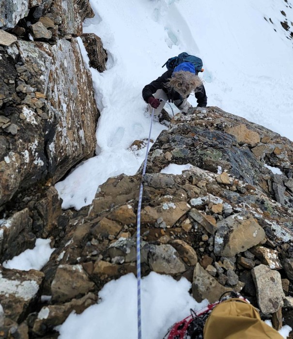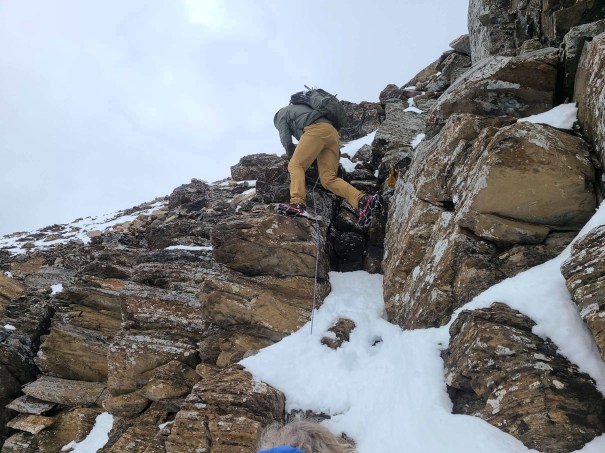 Once we arrived at the summit block, we found a short scramble up through a rock band. There was a rope, which confirmed we were at the correct weakness. The snow gave enough of a platform that we easily scrambled up this section. Once above, it was a short hike to the summit