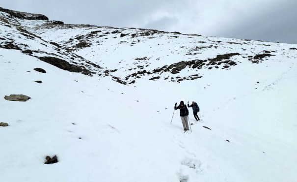Hiking boots, poles and regular day pack kit. We also had micro-spikes, and a good attitude.