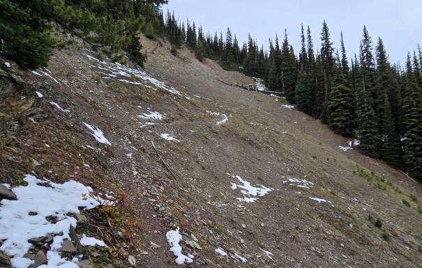 This is the only section of the trail not in the trees. It is a slumping of the slope, but the trail through here is in good shape.