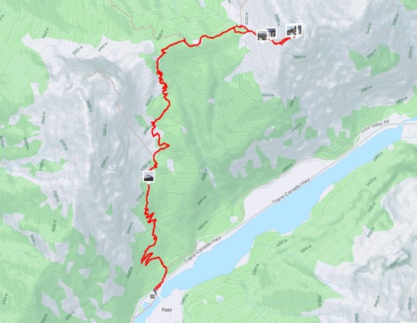 Mount Field is a very doable, straight-forward mountain in Yoho National Park. It’s got an amazingly easy trail up the massive wall to the ridge, and then a short scramble to the summit. I am sure there’s a good trail in the scree, but if not, head for the ridge and go up. Very straight-forward route finding.