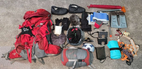 This is my 65 litre pack and gear – avalanche kit, glacier kit, and overnight gear like sleeping bag, sleeping pad, and utensils. Not shown is my share of the tent, and the stove, pot and fuel.
