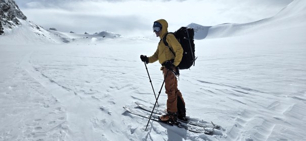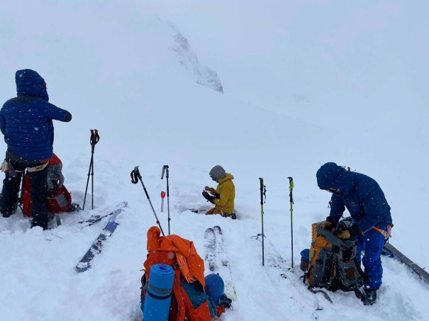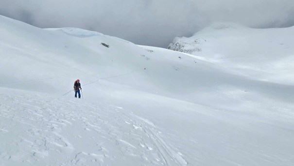 We needed GPS just to leave our campsite, and skin up to the Tremor col. We were only about 100 m down, but we were skiing blind. We were basically inside a ping pong ball, with zero definition. We couldn’t find the col entry point, yet we also couldn’t go any higher. Finally, there was a slight break in the fog, and Callum spied the entrance – he was standing right beside it!