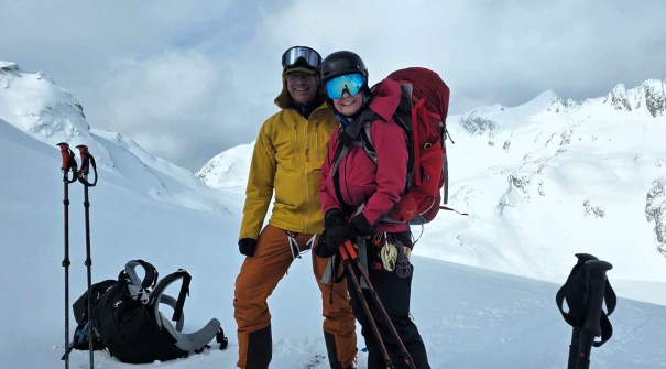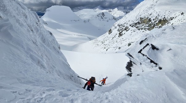 Callum (L) and Brian skiing down from Blackcomb Glacier. Skiing with massive packs takes skill and strength. Photo: Mike Dopf