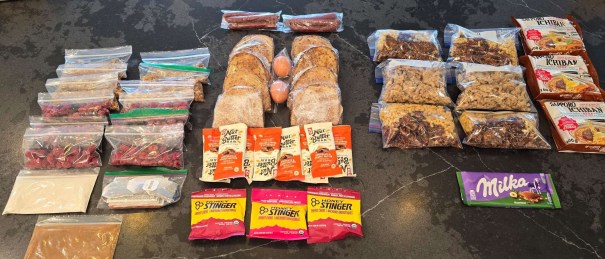 Food for four days. Three breakfasts and dinners, and four lunches. While I dehydrated everything I could, some of the heavier items are granola for breakfast, and sandwiches and energy bars for lunch.