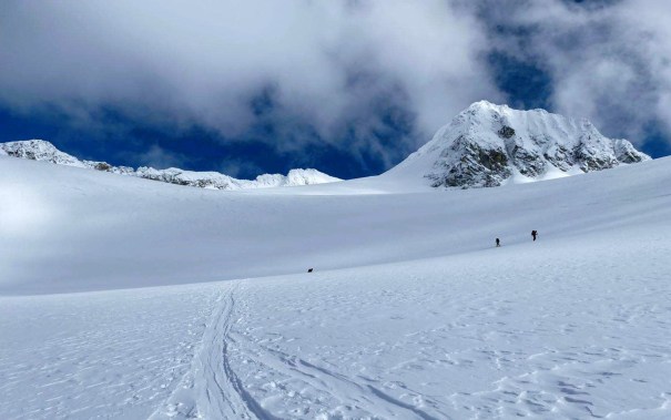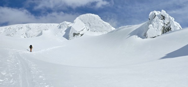 It’s almost impossible to see, but to the left of the peak are several skiers on the Trorey Glacier. They are at the base of the snow ridge, just below the Pattison bootpack.