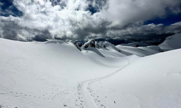 The Spearhead Traverse covers 11 glaciers and weaves around 17 peaks. The total route is 34 km, with about 1,700 m of elevation gain spread out over numerous ups and downs. Our Spearhead Traverse plan was to start early, ski half-way, and find a good spot on the glacier to spend the night. All the while enjoying beautiful blue skies and calm winds. On Day Two, we would traverse over to the Kees and Claire Memorial Hut, located at Russet Lake. We would spend two nights there, and maybe bag a summit. Then we would get up early to enjoy a lovely ski down to Whistler on Day Four. Yeah right…