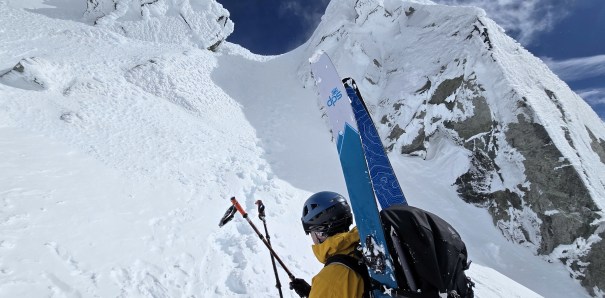 These photos that Mike took of Alisen, Brian and Callum topping out show the three different ways to pack your skis.