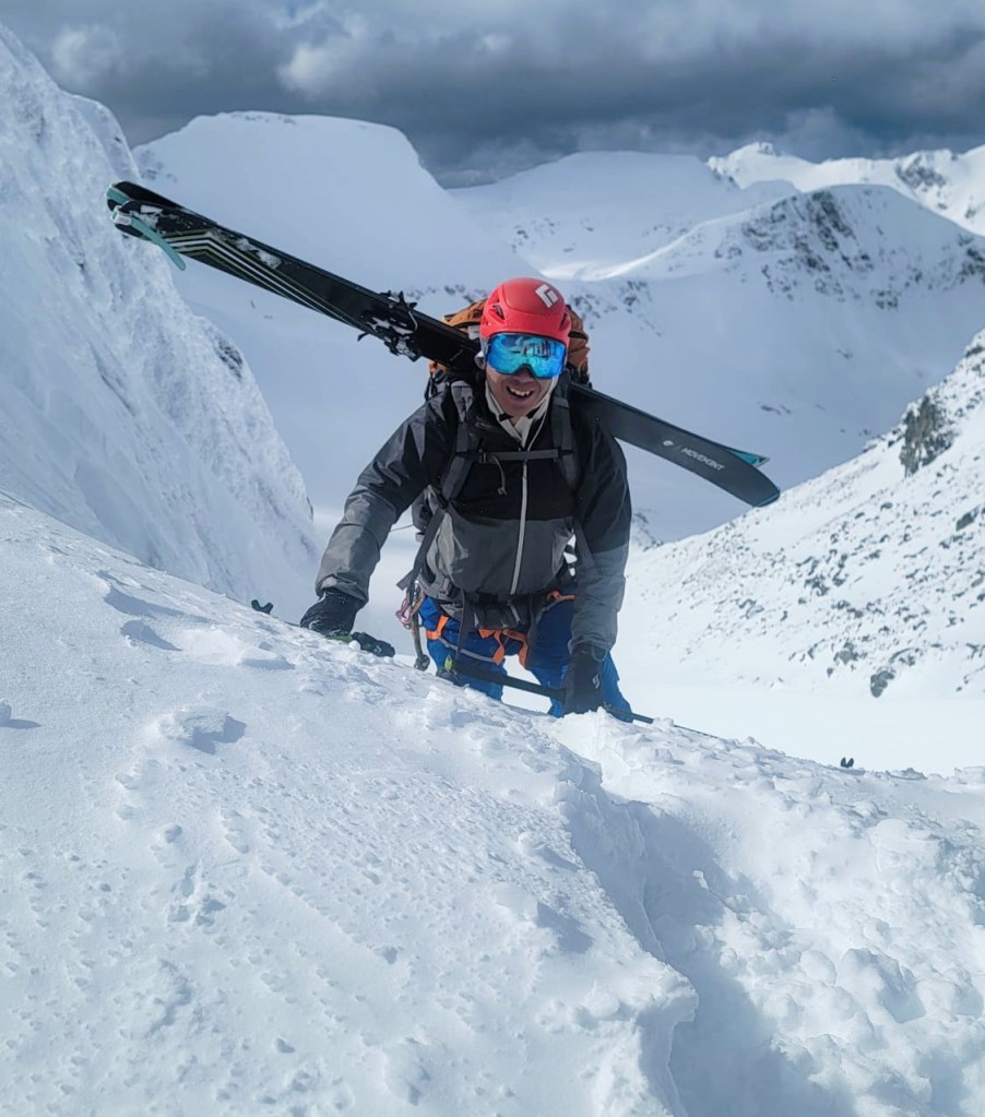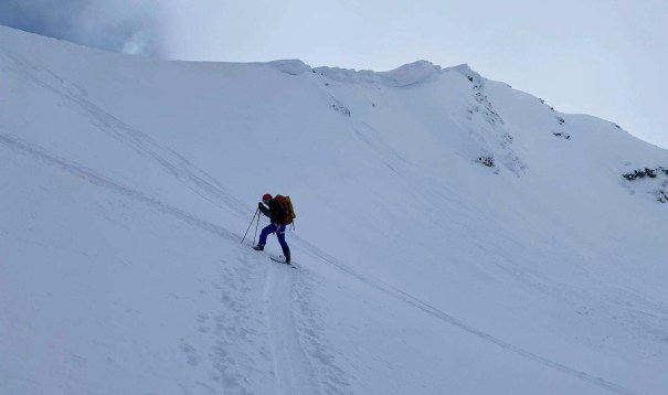 This is our ascent route up Mount Pattison, to the top of the boot pack. This was taken the day prior. The better snow to skin up was on the far left. Not ideal in a white out. Near the top, we put on the ski crampons, which really saved us as we traversed back over to the right. Photo: Brian Liu.