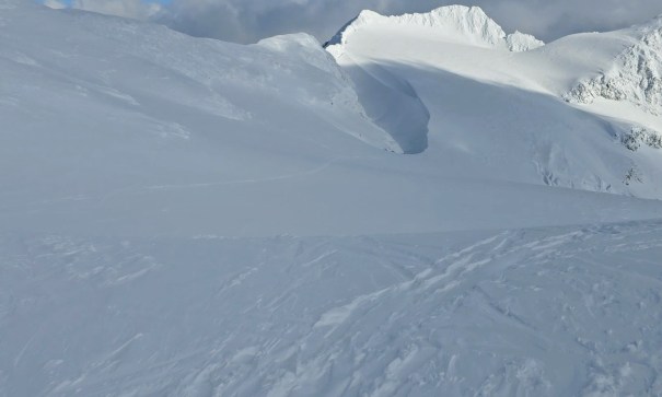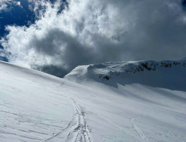 Callum was keeping track of the time. It was already 3:30 on top of Decker Shoulder. It was still snowing, but the first sucker hole was opening up. Snow was forecast to stop at 5:00 pm. Getting back down to Decker Lake was also a challenge. Why not? Again, we had to follow our skin tracks. Mike avoided skiing over some cliffs, but hit a small cornice instead. He kept it together on the other side. We had the benefit of his location, so skied higher and missed the fun.