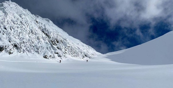 We have just skied off Mount Pattison, and are skinning across the Tremor Glacier. We skied around Tremor Mountain and ascended the col on the far side. Photo: Callum Galbraith
