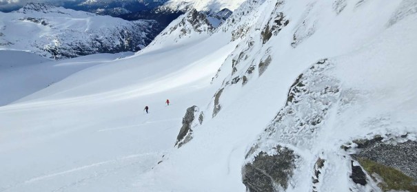 Brian and Callum are skiing down behind me. Behind them are two skiers coming out of the Decker Shoulder couloir.