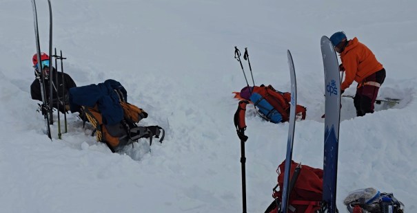 Transition #8 was ripping the skins to ski down from the col, heading towards Platform Glacier. From here, we had a great view of the “Wind Scoop” at the low point, where some people camp. We found a feature just below the col that provided a slight snow wall, and hopefully some reprieve from the wind. Wishful thinking!