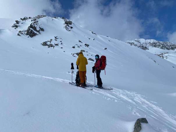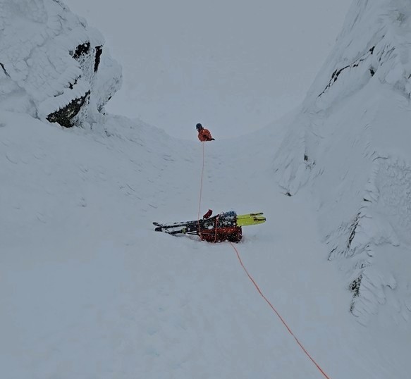 At the top of the Pattison col boot pack, Brian and Callum – our two climbers – set up the rope. We did a safety belay as we descended, just in case. Thankfully no one slipped. Brian and Callum then lowered each backpack with the skis attached.