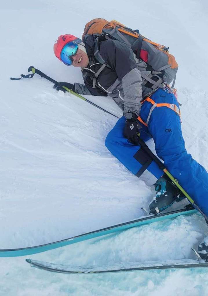 Callum lowering his skis and pack down. This really saved us energy-wise, and prevented any falls as we down-climbed.