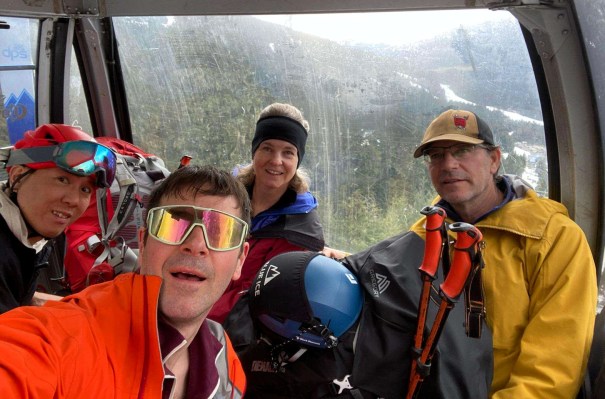 Mike was the only one really skiing this icy hell well, so we sent him off ahead. He skied down to the Whistler Village, dropped his skis, and then walked to the car park to pick up the vehicle. We finally got down to the Village a little after 7:00 pm. We had been on our skis for 10.5 hours! Mike brought the car around and we all collapsed into it.